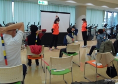 はじめは棒で肩や腰をトントン叩いてほぐしたあとは、参加者の皆さんでペアになり、お互いの棒を投げる・受け取るを交互に行う運動にチャレンジ!
